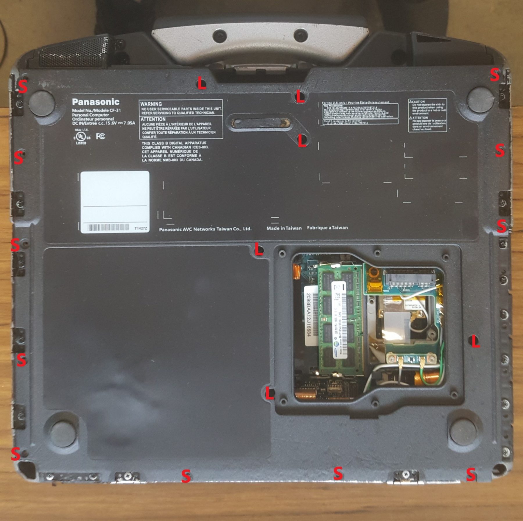 Remove the following screws from the bottom of the laptop. There are 2 different length screws. The image below is labeled L for long screws and S for short screws.