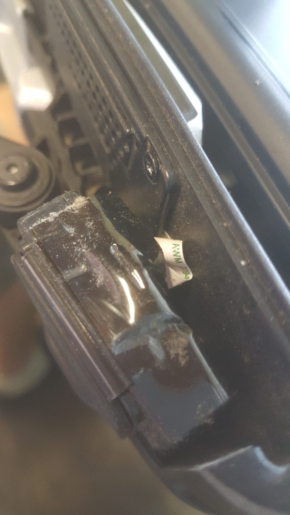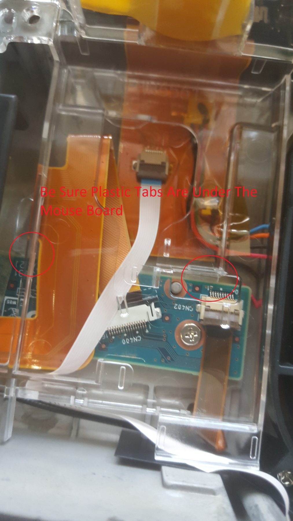 Now you can reinstall the plastic cage and screw that the cmos battery is glued to. Be sure the 2 plastic tabs are going underneath the mouse board as pictured below. Be sure to plug the cmos battery back in too.