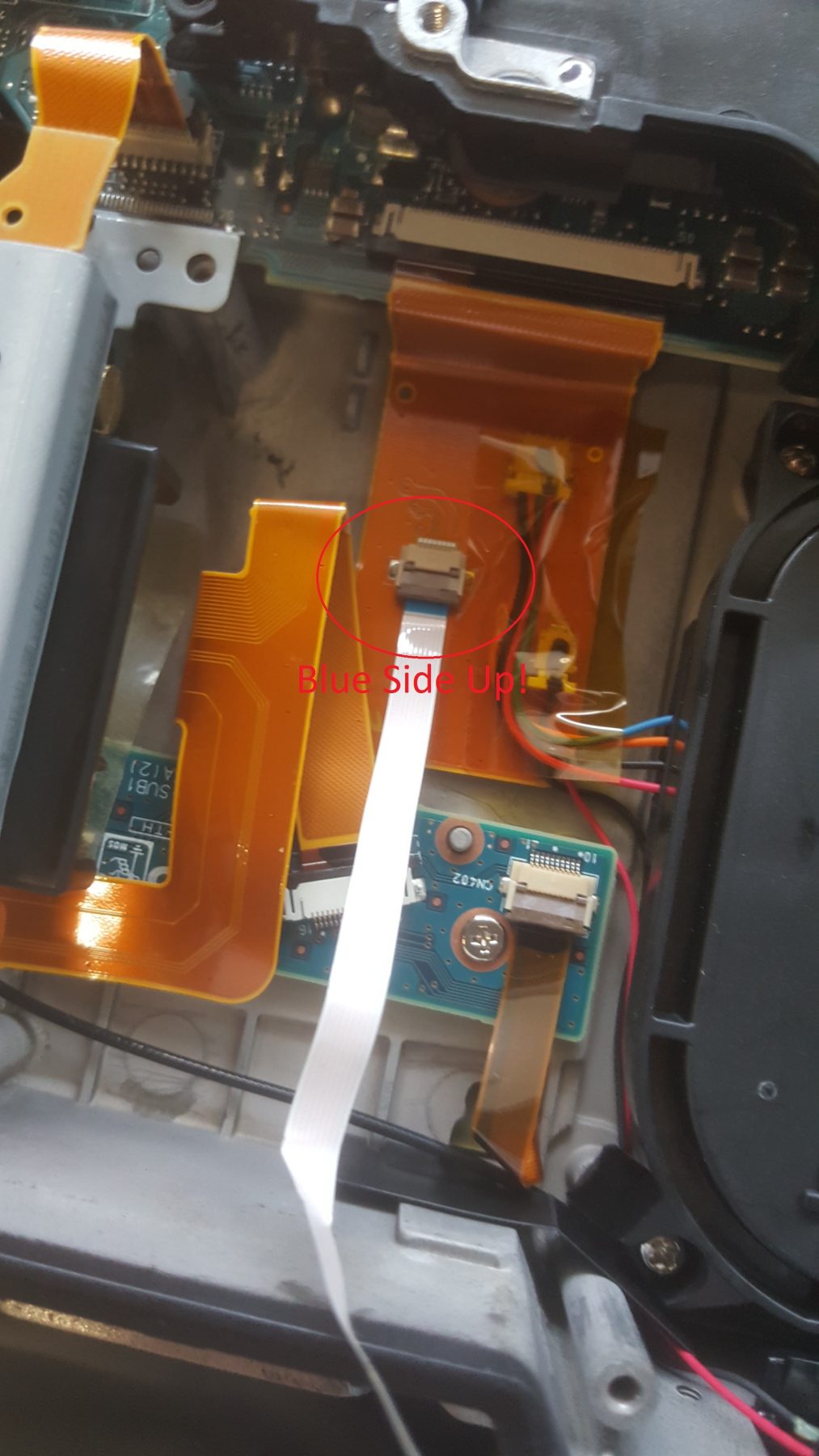 Take the other half of the finger print wire inside the chassis and plug into the outlet located on the ribbon cable pictured below. Gently pull up on the hinge retainer to open the port. Be sure the blue half of the wire end is rotated towards you. In the picture the wire is fully seated. When you have the wire fully seated push back down on the hinge to lock. If you slightly pull on the cable it should not pull out.