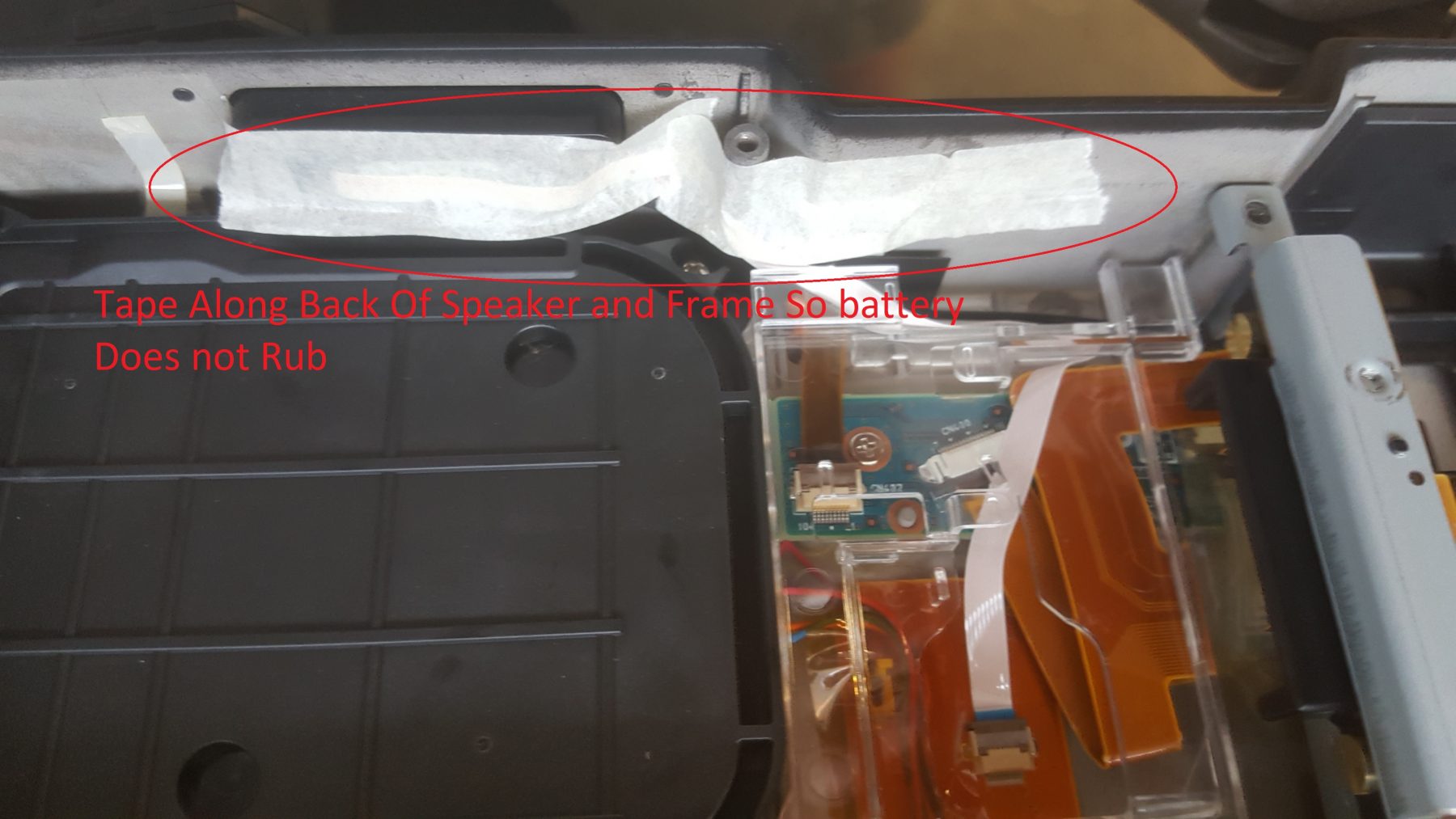 Now you can begin installing the finger print reader. 1st run the finger print cable between the chassis speaker and the plastic speaker mount as shown in the picture below. There is a slight groove the cable runs through so it will not be pinched. You should then be able to put the reader into the chassis recess shown with minimal slack left over.
