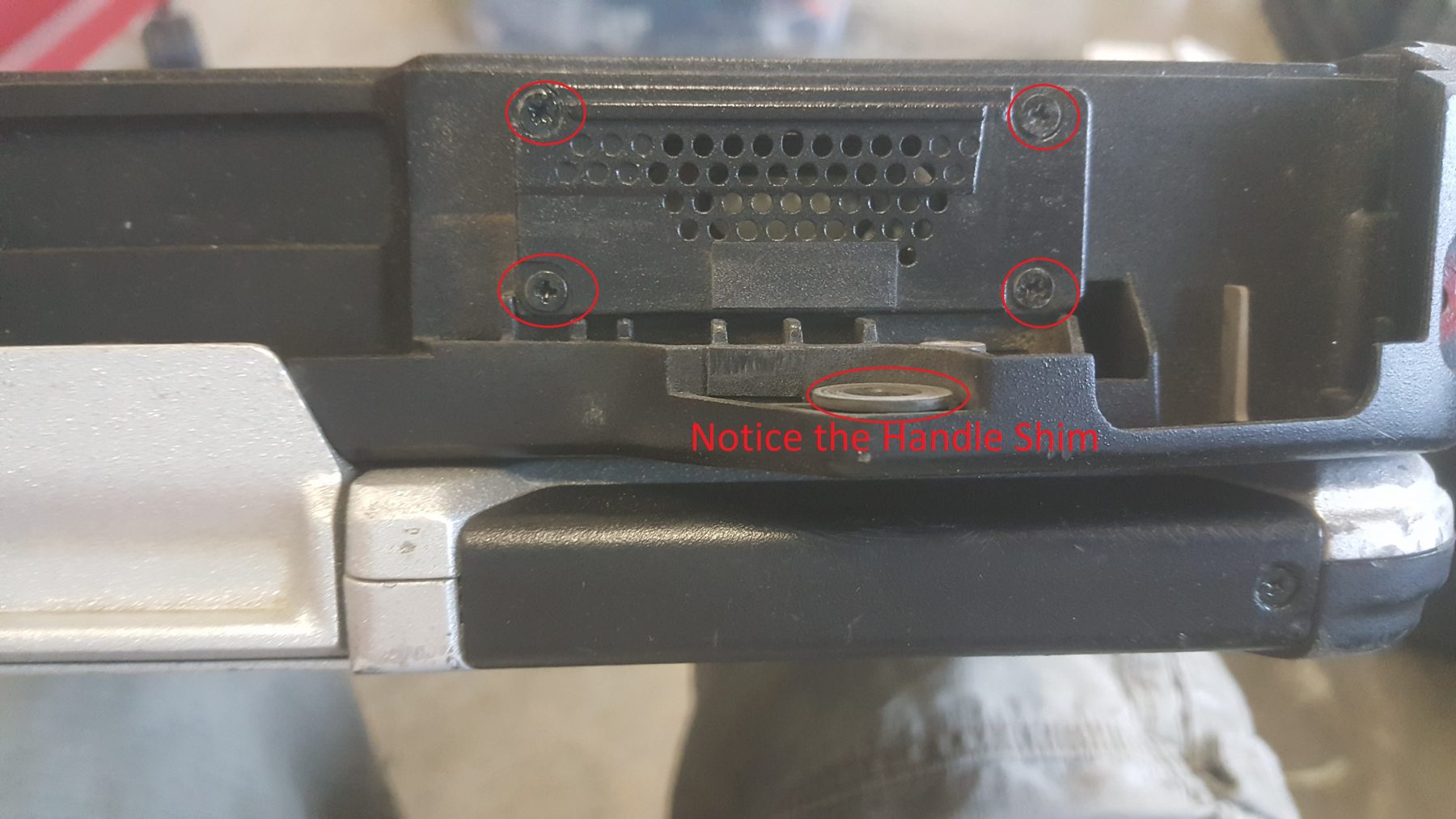 Put the carrying handle back in place and make sure there is a handle shim on each side of the handle pin. Shim pictured below.